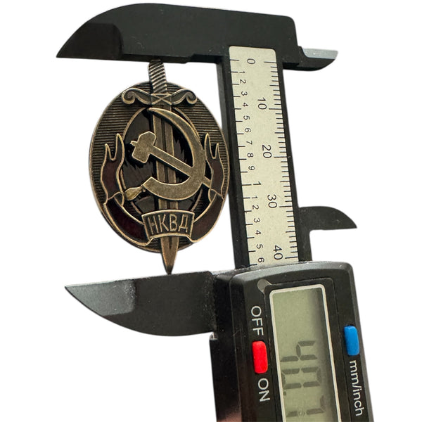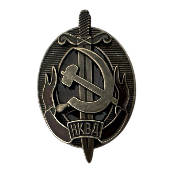 High-quality reproduction of the Soviet NKVD (People’s Commissariat for Internal Affairs) badge, featuring the sword and hammer-and-sickle emblem.