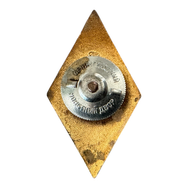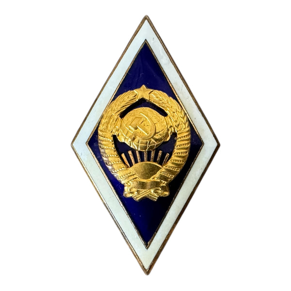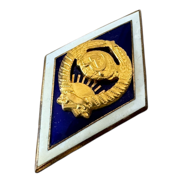 Vintage Russian Soviet-era graduation romb badge made of brass with hot enamel. Features the USSR state emblem in gilt finish on a blue and white romb base. This badge was awarded to graduates of Soviet universities and institutes across the USSR.