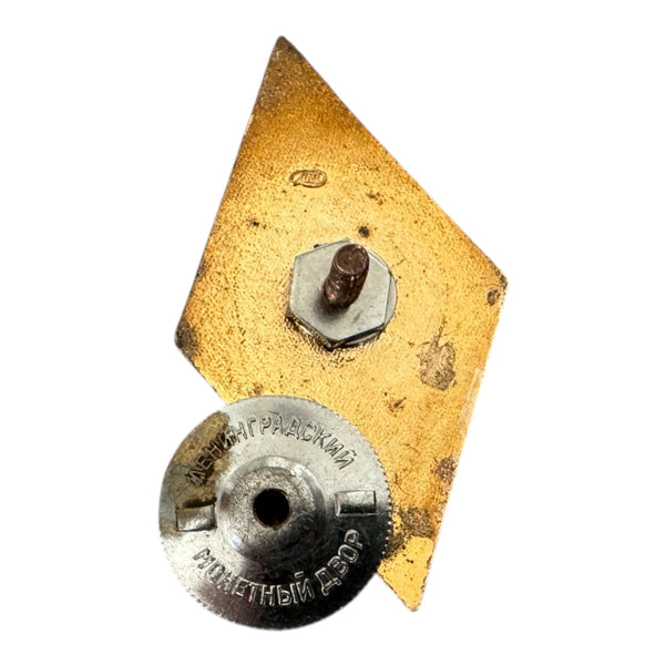 Originally produced in the Soviet Union (USSR). The reverse side has a screw-back fastener stamped Ленинградский Монетный Двор (Leningrad Mint).