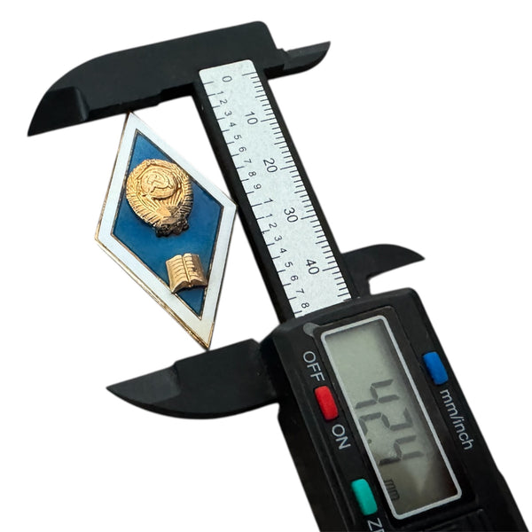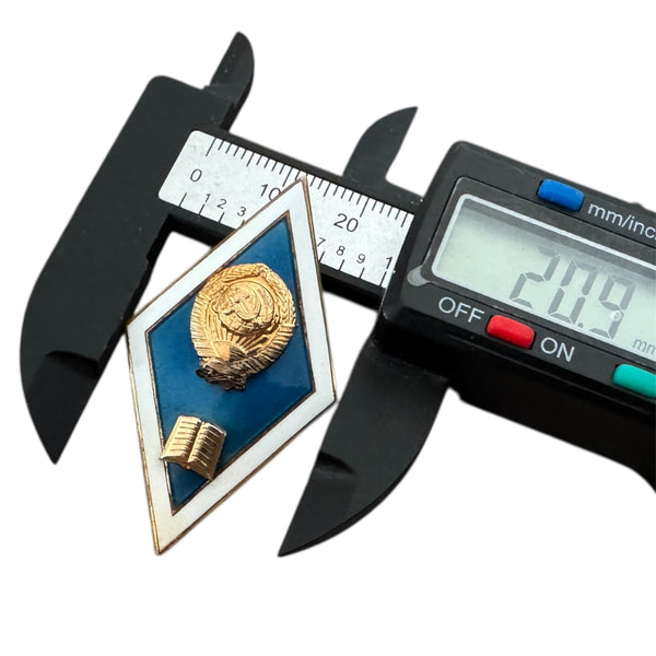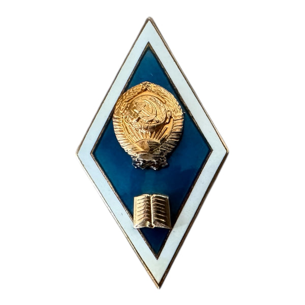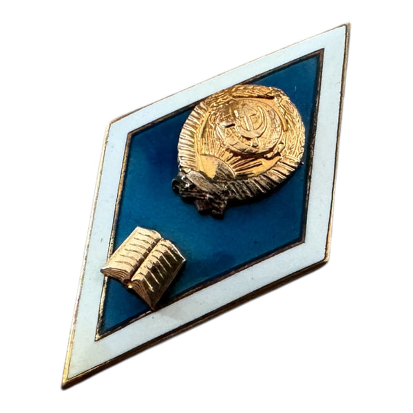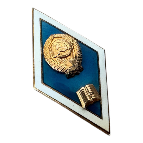 Authentic Soviet graduation badge from the 1960s–1980s. Made of brass with blue and white hot enamel, featuring the USSR State Emblem and an open book symbol.