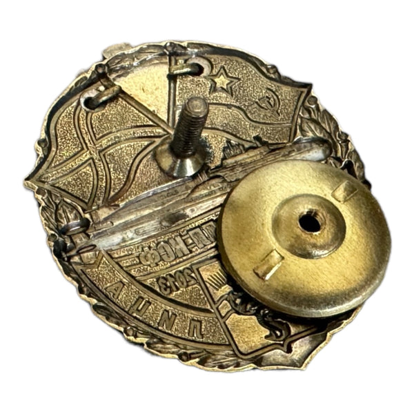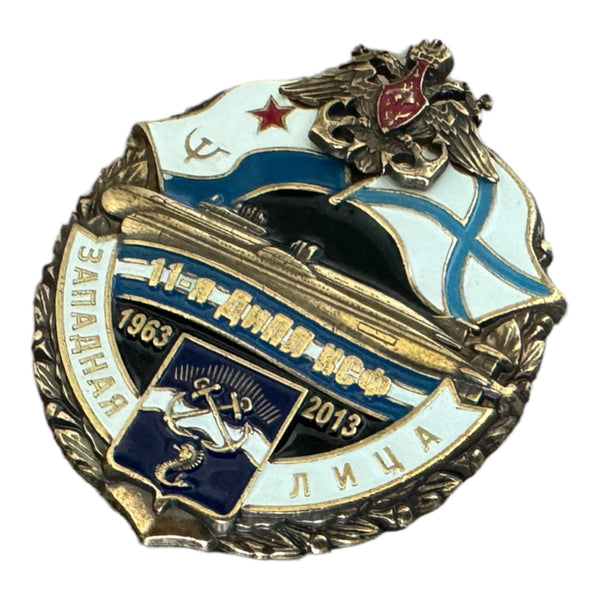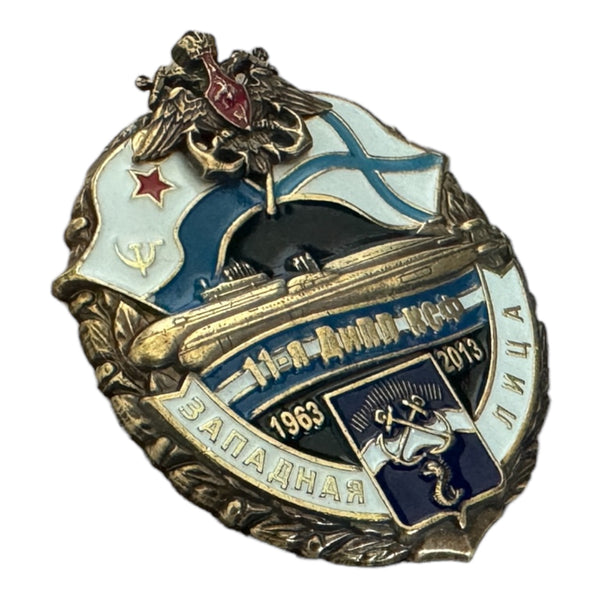 This rare brass and enamel badge honours the Russian Navy Submarine Base Zapadnaya Litsa (1963-2013) and features a screw on the back for attaching it to a hat or jacket.
